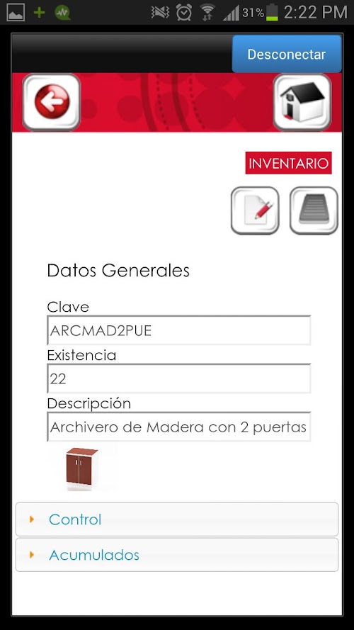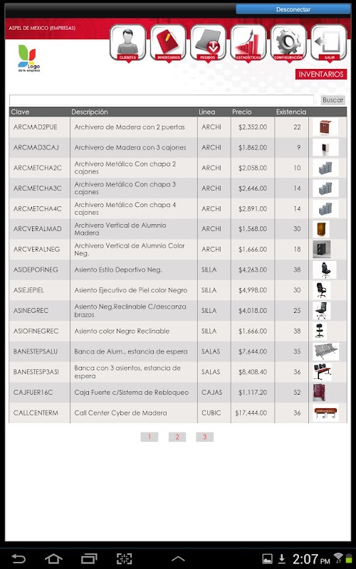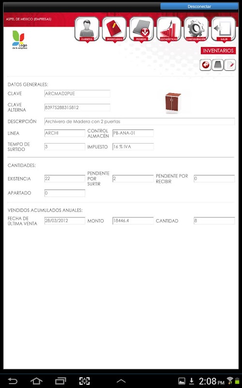 c) Inventories. This option only provides information about the inventory of the company registered in SAE 5.0 Aspel, and check store stock for each product and price lists available.