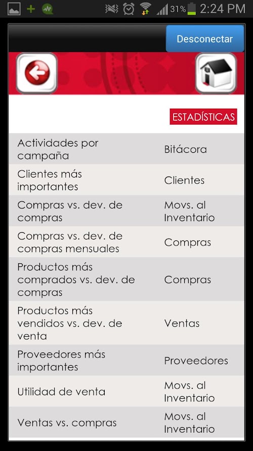 e) Configuración. Permite realizar la configuración de la imagen para el logotipo y la selección de las estadísticas que se desea visualizar por cada empresa. La opción “Seleccionar Estadísticas”: Muestra la lista de todas las estadísticas que se encuentran definidas en Aspel-SAE 5.0, mismas que al ser activadas se pueden visualizar en SAE Móvil.