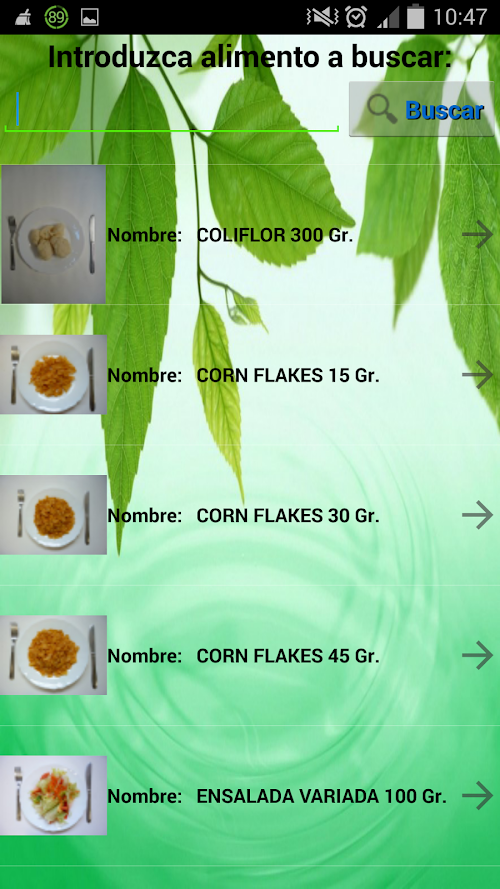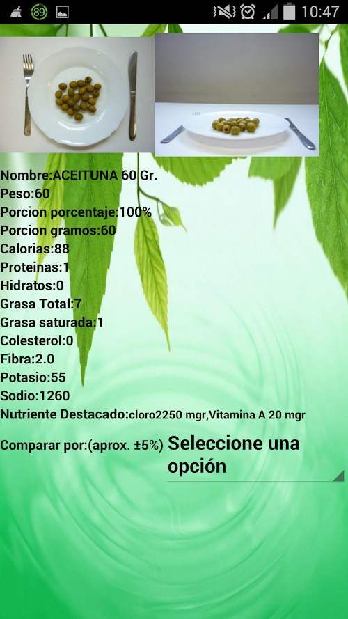 It also includes the possibility to compare a food selected from the list containing the application via a nutrient previously chosen (Fat, Carbohydrates, Protein and Total Fat) with an accuracy of 5%.