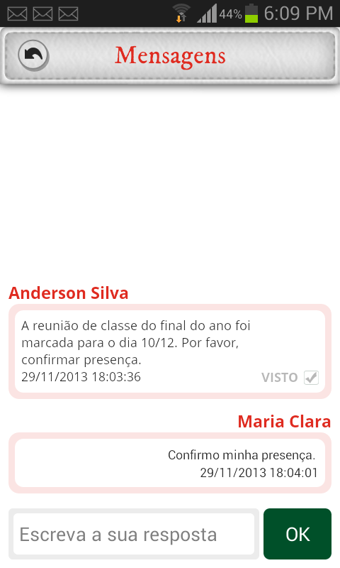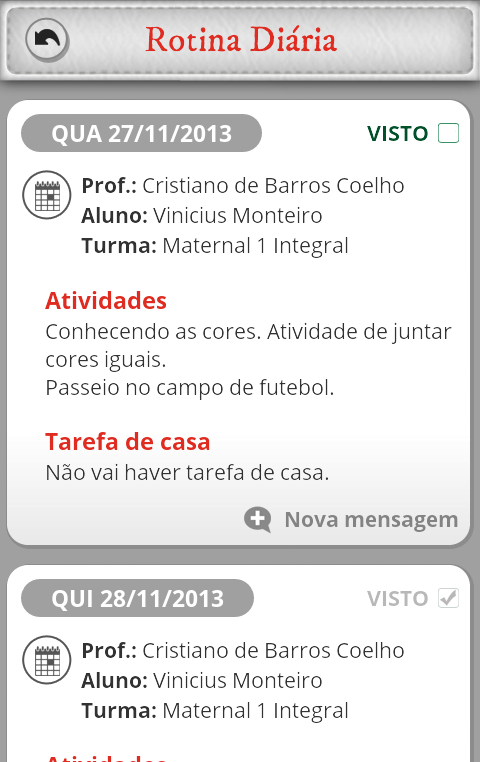 The Reason College School Tellme app includes the same fields of traditional paper calendars, in addition to offering new and exclusive areas of school support. Thus, the application enables registration information from the daily routine information and details about various notices from the school, as well as record of events through images (pictures). Additionally, the application contains a message field, where the school can write important information to students and / or their family members (caregivers) and vice versa. It is noteworthy, therefore, that the application allows record information when a teacher in any of the fields of the agenda or record a message to the application, students or their guardians receive them instantly.