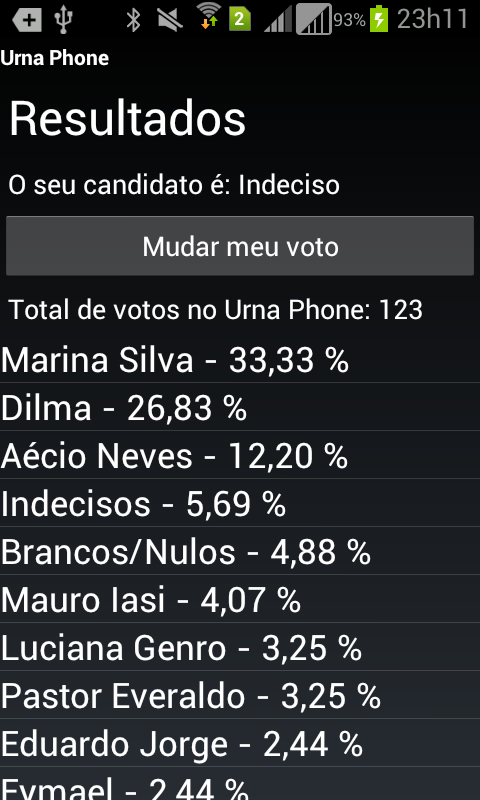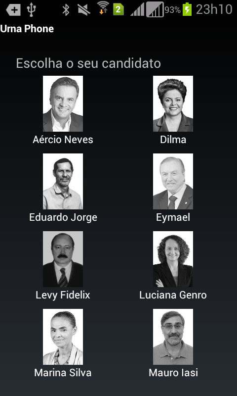 Pesquisa eleitoral paralela disponível para Windows Phone e Android. Urna Phone é um aplicativo onde você escolhe o seu candidato e vê a porcentagem de votos para cada candidato. Cada aplicativo em cada telefone pode fazer apenas 1 voto. Veja agora como estão os votos para quem tem o Urna Phone instalado. No Urna Phone seu voto é sigiloso, não armazenamos seus dados Parallel election poll available for Windows Phone and Android. Urn Phone is an app where you choose your candidate and see the percentage of votes for each candidate. Each application on each phone can do just one vote. Watch how the votes are for those who have installed the Urn Phone. In Urn Phone your vote is confidential, we do not store your data