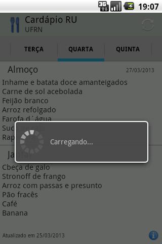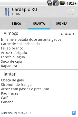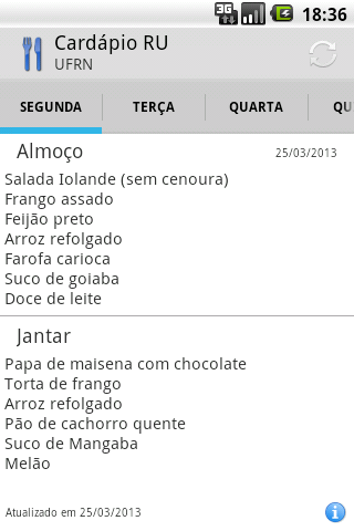 Este aplicativo apresenta o cardápio semanal do Restaurante Universitário da UFRN. O cardápio é salvo no celular e pode ser acessado mesmo sem conexão com a Internet.