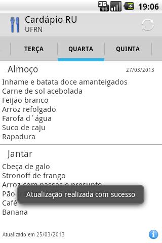 O cardápio deve ser atualizado manualmente (botão superior direito) uma vez por semana para que os dados do cardápio atualizado sejam armazenados no celular. O aplicativo também possui a funcionalidade de passar a página ao deslizar o dedos sobre a tela, de uma lado para o outro.