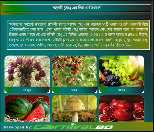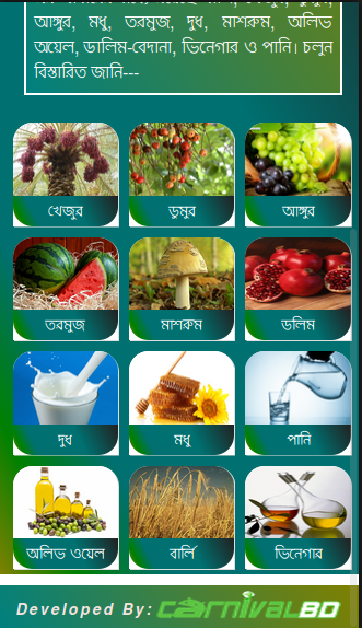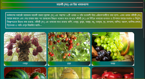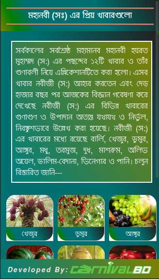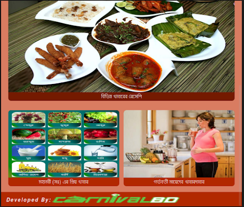 এই এপ্লিকেশানে স্পেশাল ফিচার হিসেবে “মহানবী (সঃ) এর প্রিয় খাবার” ও “গর্ভবতী মায়েদের খাবার” এড করা হয়েছে।