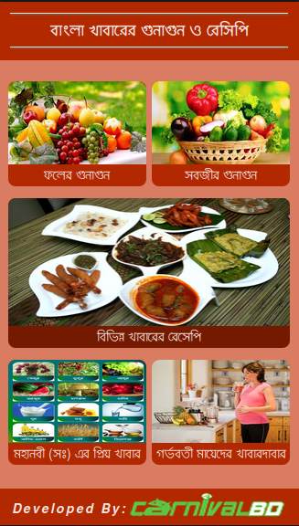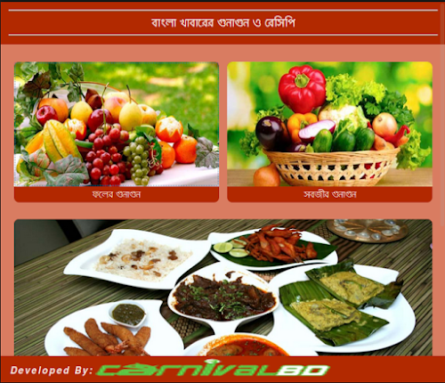 আমাদের এই এপ্লিকেশনে সব ধরনের বাংলা খাবারের রেসিপির সাথে সব ধরনের সবজী ও ফলের গুনাগুন এড করা হয়েছে।