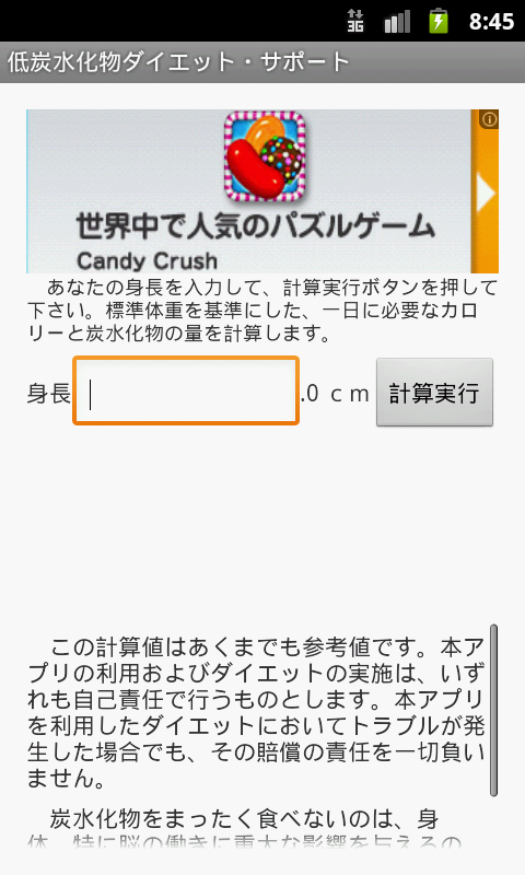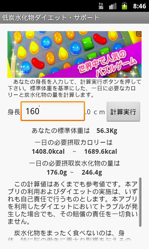 ・身長から標準体重を割り出し、一日に必要な摂取カロリーと、炭水化物の量を計算します。