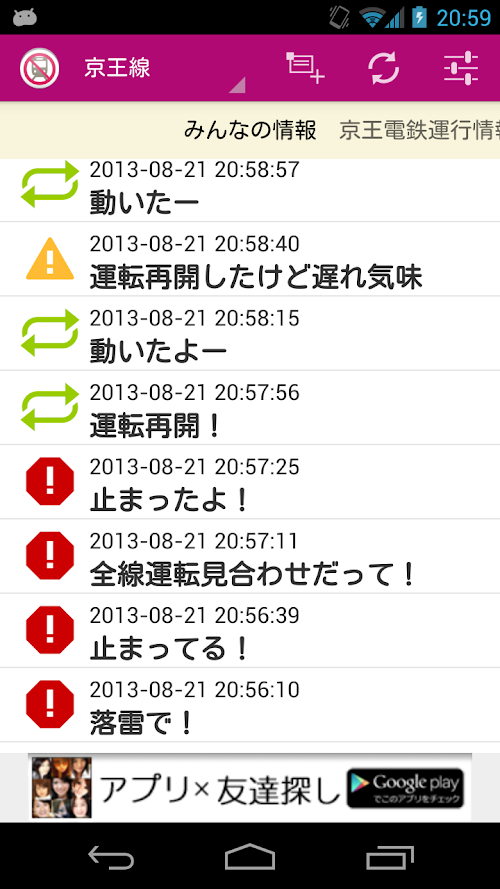 京王線、京王井の頭線の運行状況の情報共有アプリです。