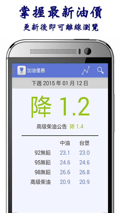 載入資料後,將可離線查看近期油價資訊,不需每次上網下載