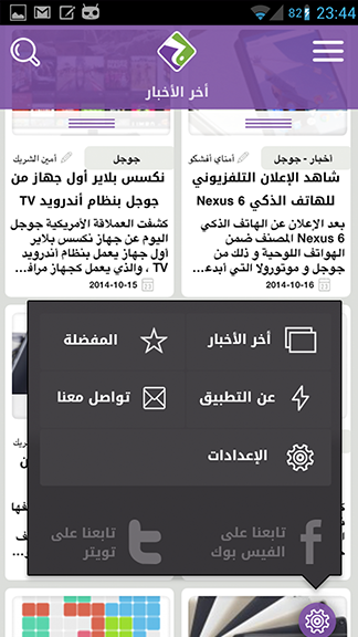 • امكانية نشر المقالات على تويتر وفيس بوك وإمكانية النسخ والفتح في المتصفح