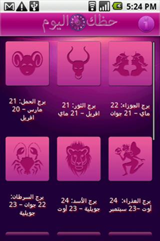 يتيح لك التطبيق التعرف بسهولة وبساطة على حظك اليومى مع النجوم : برج الحوت , برج الثور, برج الجوزاء , برج السرطان , برج الاسد , برج العذراء , برج الميزان , برج العقرب , برج القوس , برج الجدي , برج الدلو , برج الحمل