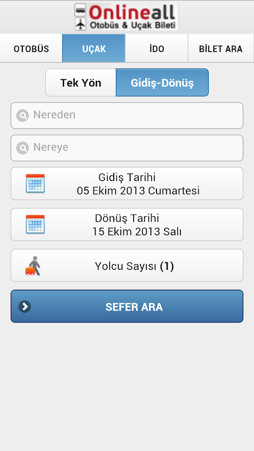 OnlineALL.Net Hakkında : 2012 Yılında, Türkiye’nin En Seçkin Otobüs Firmalarının Alt Yapı Sağlayıcısı Olan İpektr Alt Yapısını Kullanarak, Otobüs Bileti ve THY, Anadolujet, Sunexpress, Atlasjet Uçak Biletini Aynı Platformda Toplamıştır. Bu Yüzden Onlineall.Net Sitemiz Online Otobüs Bileti Ve Online Uçak Bileti Arama Motorudur.