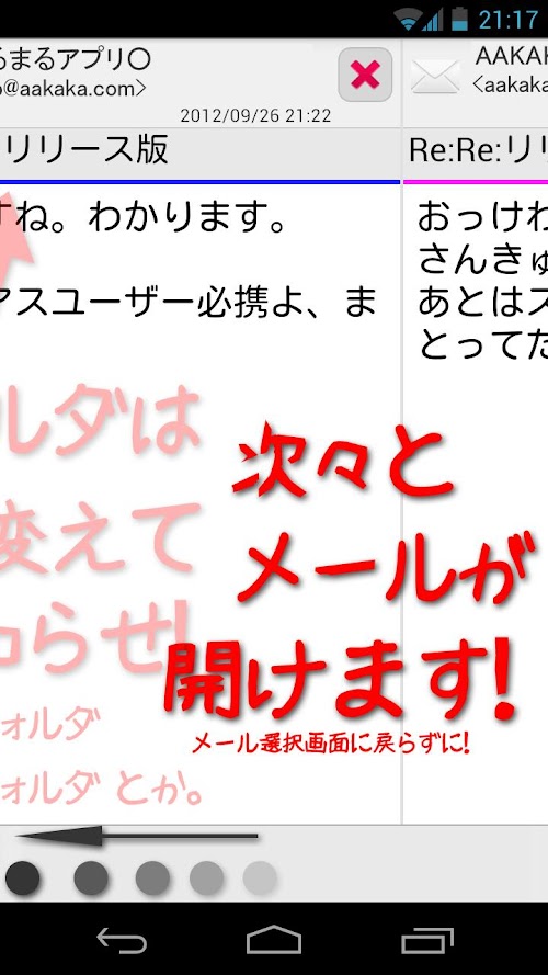 本のページをめくるように画面をスワイプすると次々にメールを開くことができます。