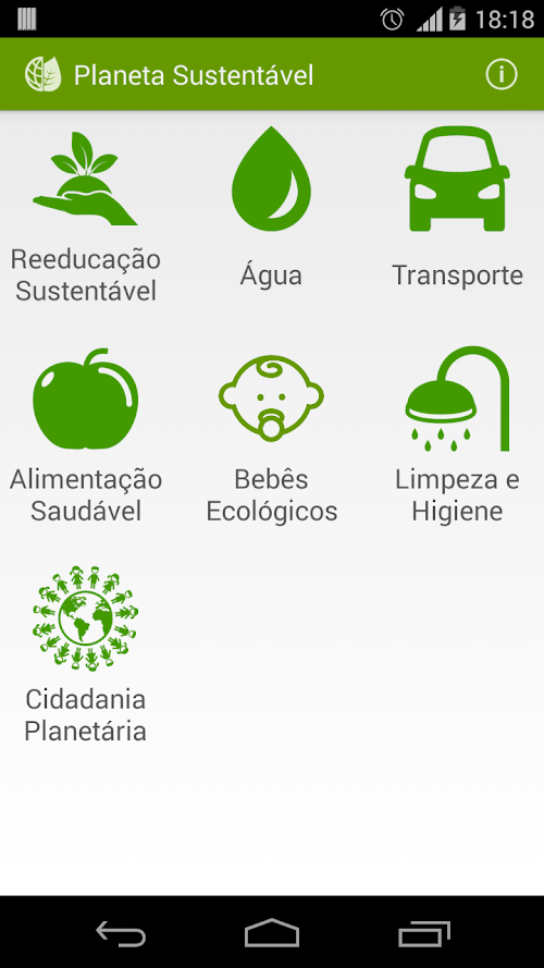 As informações contidas no aplicativo Planeta Sustentável estão organizadas em 7 categorias: