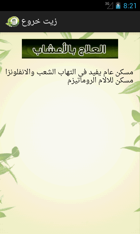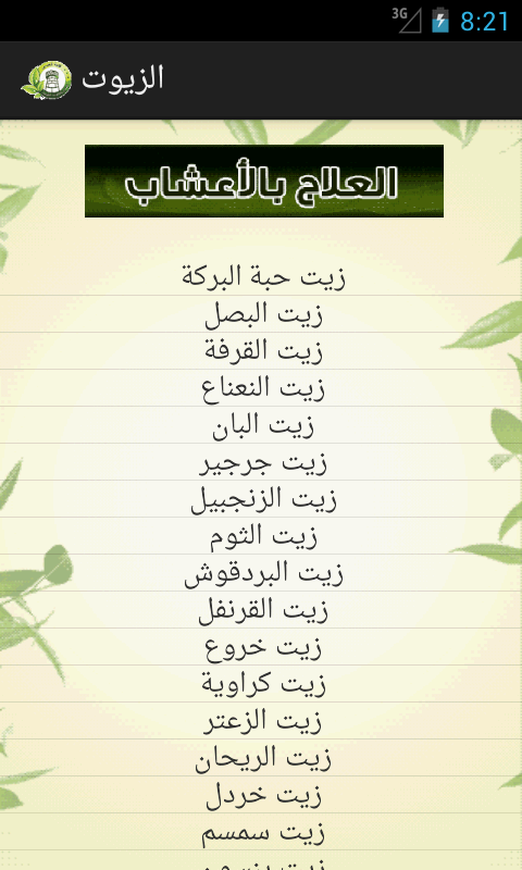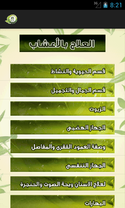 يحتوي هذا التطبيق على اقسام عديدة مثل الحيوية والنشاط,الجمال والتجميل,الزيوت,الجهاز الهضمى,العمود الفقرى والمفاصل,الجهاز التنفسى,الاسنان وبحة الصوت والحنجرة, "البهارات, "المشروبات الشعبية وكل قسم يبين ماهي الاعشاي المناسبة لتتداوي بها ... This application contains sections many such vitality and activity, beauty and cosmetics, oils, gastrointestinal tract, spine and joints, respiratory system, teeth and hoarseness and throat, "spices," drinks popular and each section shows what Alaashaa appropriate Ttdaoa out ...