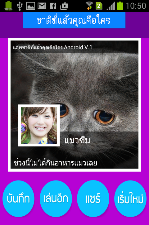 หมายเหตุ: แอปชาติที่แล้วคุณคือใครนี้ ถึงแม้จะทำออกมาเพื่อความสนุก แต่ระบบประมาณผลจะทำการประมวลผลจริงๆ โดยการใช้ระบบ Face Recognition และต้องอาศัยบุญบารมีอยู่บ้าง ดังนั้นเพื่อความสนุก เฮฮา มุ้งมิ้ง ฟรุ้งฟริ้ง สุดติ่งกระดิ่งแมว ขอความกรุณาระมัดระวังในการเลือกภาพ และอย่าลืมอธิฐานด้วย เพระมันแม่นยำเกินจะบรรยาย ขอให้สนุกกันนะจ๊ะ But if you would rely on expensive fortune is what it is. What do you think of the new with the app then you are. Apple faces the physiognomy. Check the halo ORA glory Captured analyze unscientific. In order to answer that. Who will you? Tmewr to commit anything to anyone about you. To solve it (oil boxing help it).