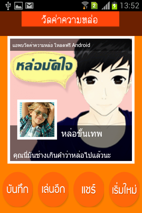 หมายเหตุ: แอปวัดค่าความหล่อนี้จัดทำขึ้นมาให้คุณได้วัดระดับความหล่อที่มีอยู่ในตัวคุณ ถ้าไม่มั่นใจตัวเองลองใช้งานแอปนี้รับรองจะช่วยเพิ่มคามมั่นใจให้คุณโดยระบบ Face Recognition นี้จะคำนวณค่าความหล่อของคุณออกมาแล้วแจ้งให้คุณได้ทราบผล รับรองว่าสนุกกว่าการถ่ายรูปเล่นๆแน่นอน แถมยังแชร์ไปยังสื่อสังคมออนไลน์ได้อีกด้วย มาเล่นกันเยอะๆนะThis app lets you reward your friends. No need to ask, you may lack self-confidence. If not, then maybe try to get to know you, the handsome one. Size is known quote that has it. But I could not tell you. The app will tell you not ashamed to do it. Plus, you can bring your friends race to level with you. I guarantee that it is fun and you do not want to put your device ever.
