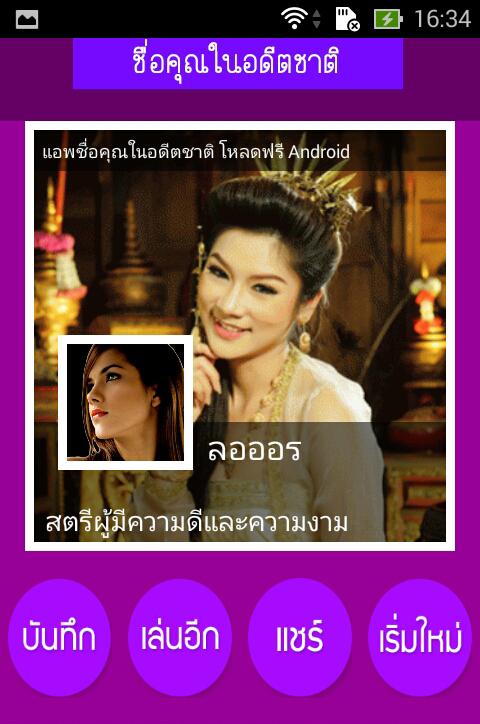 คุณชื่ออะไรในอดีตชาติ เป็นแอปที่ช่วยให้คุณล่วงรู้ถึงชื่อของคุณในกาลก่อน มันช่วยได้มากเลยถ้าคุณอยากย้อนอดีตกลับไป ถึงแม้แอปนี้จะทำได้แค่ย้อนเวลากลับไปเพื่อบอกชื่อ แต่มันก็สำคัญมากนะว่าในอดีตคุณชื่ออะไร มันจะบอกตัวตนของคุณในปัจจุบันได้ดีเลยแหละ