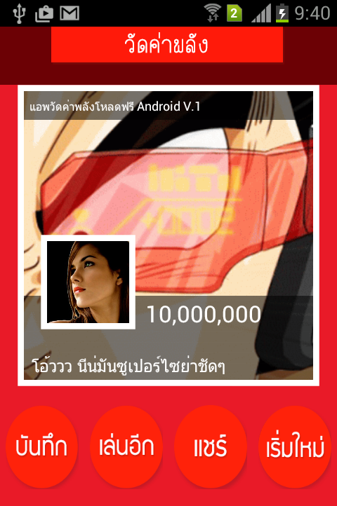 หมายเหตุ: แล้วคุณได้เห็นพลังในตัวคุณแล้วใช่ไหม จะช้าอยู่ทำไมเอามันออกมาโชว์เลย ผลของการแสดงมันเป็นพลังในตัวคุณจริงๆ เอาออกมาโชว์เลย อย่าเก็บไว้ โดยการใช้ระบบ Face Recognition จะช่วยให้คุณค้นพบพลังในตัวคุณแบบที่คุณแทบจะไม่เชื่อเลยก็ได้ว่าตัวคุณมีพลังแบบนี้อยู่ในตัวคุณจริงๆ คำเตือนเล่นแบบพอดีๆ เพราะเราไม่รับประกันหากพลังของคุณลดลง ... For this App will help find the power within you through the numbers. Then calculate and display you already know the answer. It has the power to render out to show your friends. On the social network as well. You do not need to rush or Not just your health, you have a device that can use the camera. Now you can see the power of which can be enormous, but it's not. Through a photograph or an image that is a measure of the power. I'm not actually measured power .... Let's see who is more common with that power.