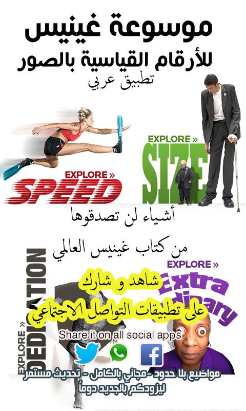 - تستطيع مشاركة محتويات التطبيق من صور و كتابات بلمسة واحدة على جميع تطبيقات التواصل الاجتماعيSelections from the Guinness Book of Records