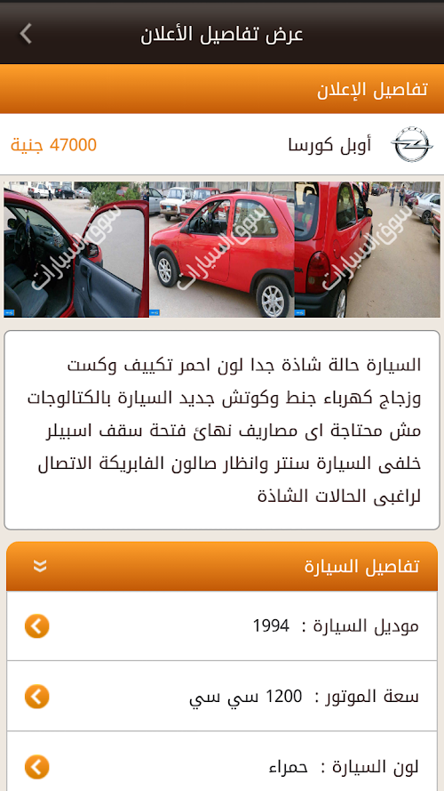 الأن مع تطبيق سوق السيارات تستطيع الأعلان و بيع سياراتك الجديدة و المستعملة بطريقة سهلة و بسيطة في أكثر من 18 دولة عربية. يتميز التطبيق بسهولة إضافة الإعلانات و التواصل مع المشتري حتي يتم البيع بإذن الله. يتميز التطبيق بالخصاءص التالية :