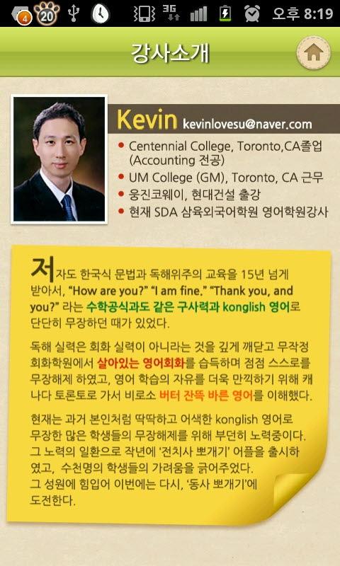 - 많은사람들이 스마트폰 어플을 통해서 영어공부를 하고자 영어회화 어플을 다운받지만, 지하철이나 공공장소에서 입을 열기란 쉽지가 않죠. 그래서 출시했습니다.! 영어어플을 통해서 우리가 약한 부분을 보충시켜주는 단과 강의!