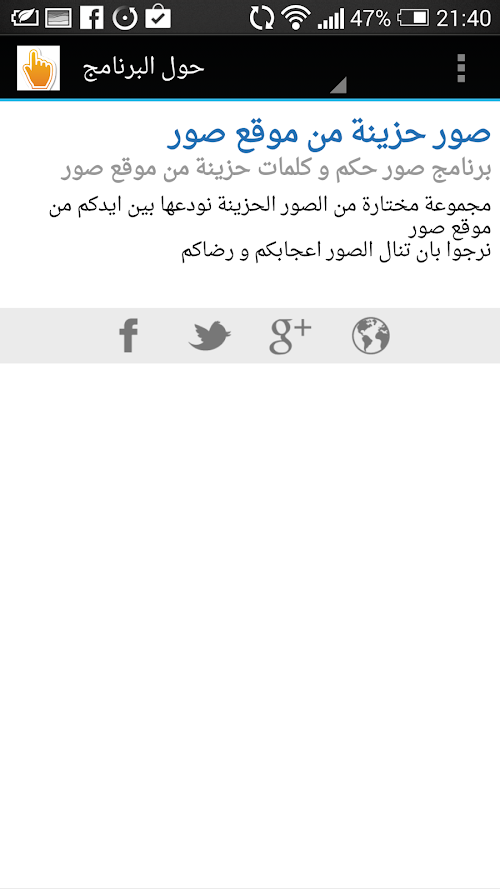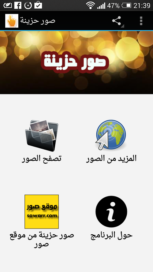 البرنامج الجديد يتميز بخاصية استعراض الصور في حال عدم وجود الانترنت من خلال الباقة المحمله عليه و ايضا بتصفح الصور من خلال خاصية التغذية من السيرفرات المباشرة و ايضا استعراض الصور من خلال موقعنا بشكل مباشرPhotos from the site of the sad pictures