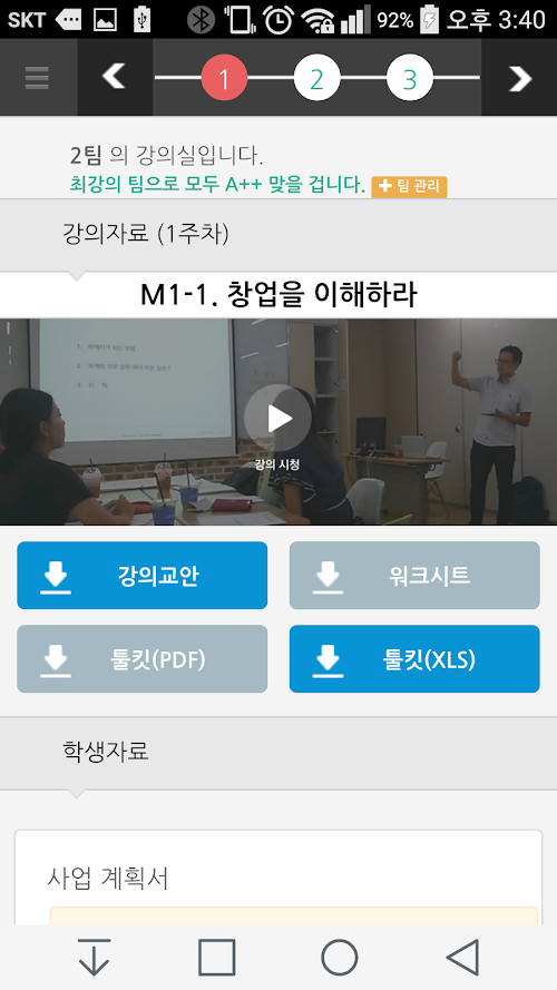 - 학생의 클래스구성을 통해 전체 커리큘럼 내에서 사업계획서를 완성해 가는 과정 제시