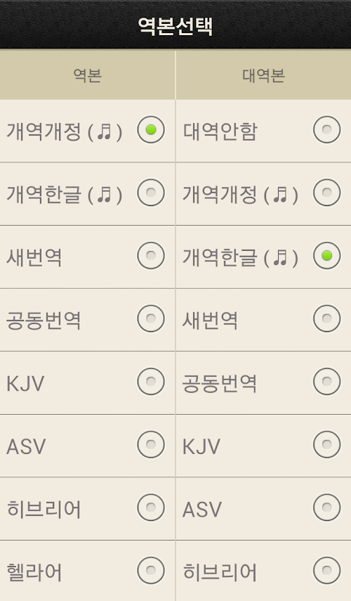 ・역본 선택 : 2가지 역본을 선택하여 상/하로 비교 읽기