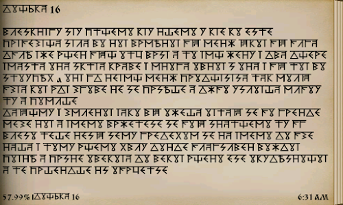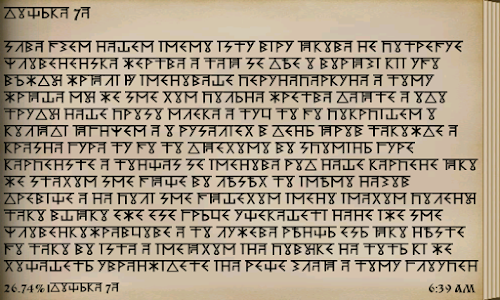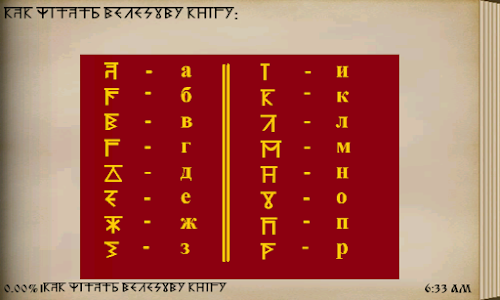 Veles book is written in a language that is completely unlike any of the Slavic languages. This program represents the original Book of Veles, how it was recorded Mirolyubovo (ie not a translation into modern Russian). Texts on the plates were cut special alphabet, which is believed to supporters authenticity of the book, was an archaic variant of the Cyrillic alphabet. Texts typed in the program type that implements this alphabet.