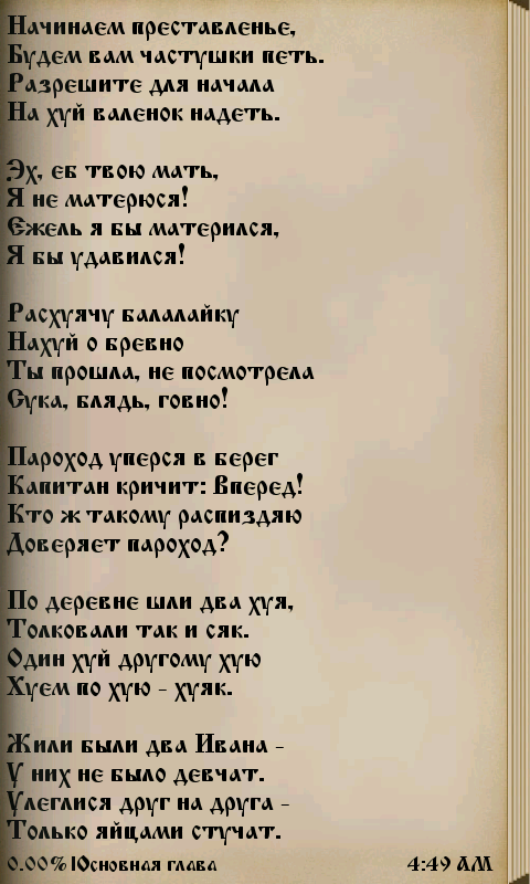 Вашему вниманию предлагается сборник матерных частушек - замечательного примера подлинно народного творчества! Большинство из них датируется советским и современным периодами нашей истории, но некоторые, очевидно, восходят еще ко временам Царской России. Частушки в программе разбиты на категории: