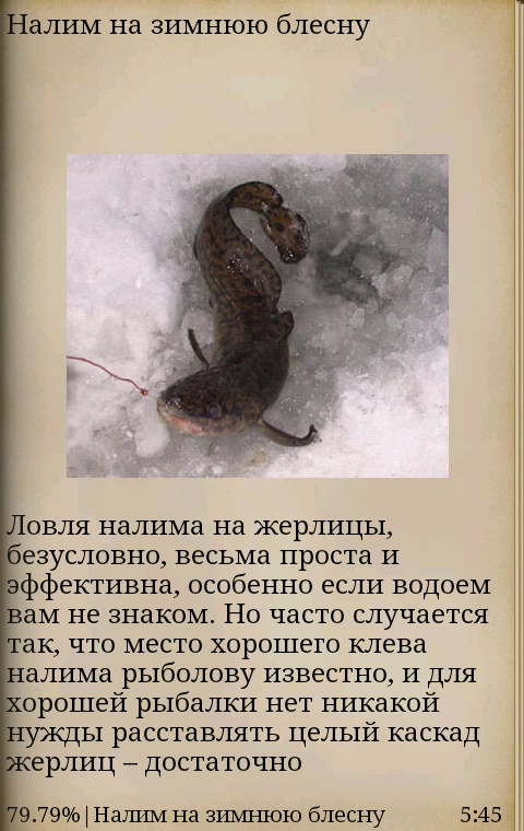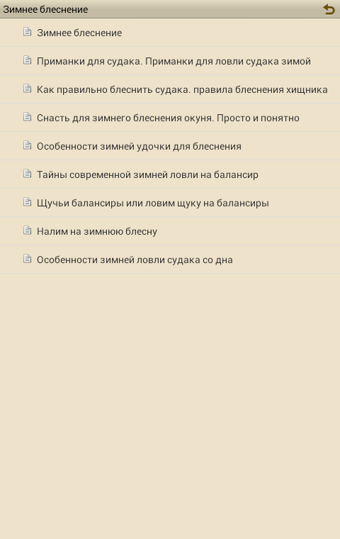 Если вы любите зимнюю рыбалку, то это приложение будет вам полезно - из него вы узнаете различные способы зимнего блеснения и ловли разных видов рыб.