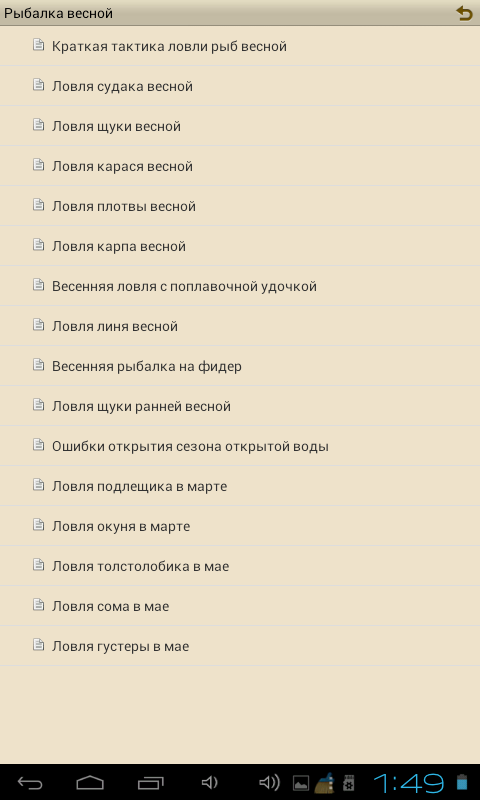 Из приложения вы узнаете о весенней рыбалке, о том как ловить разные виды рыб при разных погодных условиях.