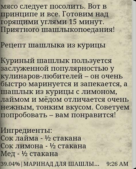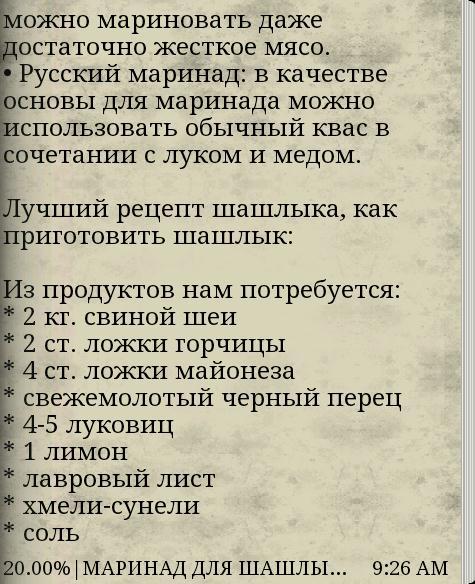Небольшой, но очень полезный и удобный сборник самых популярных и вкусных рецептов для шашлыка. Из книги Вы узнаете как правильно сделать вкусный маринад, какое мясо использовать и узнаете рецепты для разных видов мяса. Также есть сборник советов по приготовлению шашлыка. A small but very useful and convenient collection of the most popular and delicious recipes for barbecue. From the book you will learn how to make a delicious marinade what meat to use and learn recipes for different kinds of meat. Also there is a collection of tips on cooking kebabs.