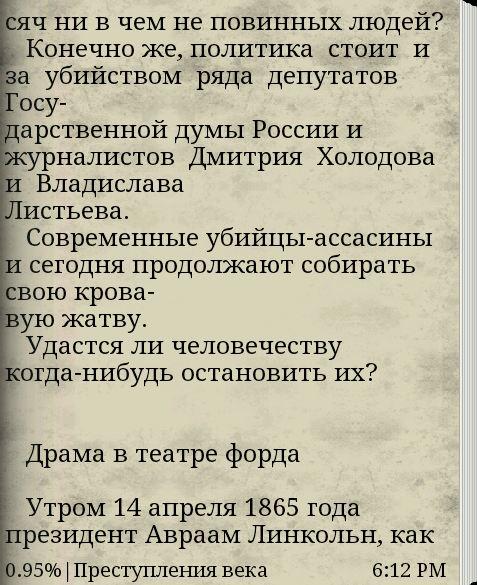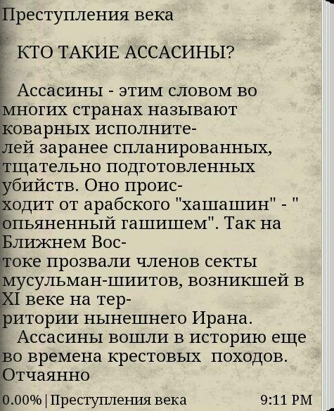 Очень интересная книга, в которой собраны факты преступлений века которые иногда даже шокируют. Вы не поверите на сколько могут быть хитры и изощренны планы преступников. A very interesting book, which collected evidence of crimes century sometimes even shocking. You would not believe how many can be tricky and sophisticated plans criminals.