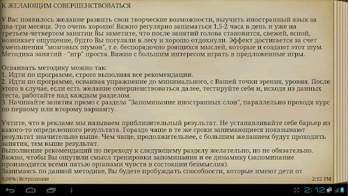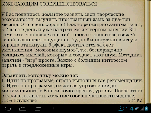 У Вас появилось желание развить свои творческие возможности, выучить иностранный язык за два-три месяца. Это очень хорошо! Важно регулярно заниматься 1,5-2 часа в день и уже на третьем-четвертом занятии Вы заметите, что после занятий голова становится, свежей, ясной, возникает ощущение, будто Вы погуляли в лесу и хорошо отдохнули. Эффект достигается за счет уменьшения "мозговых шумов", т.е. беспорядочно роящихся мыслей, которые и создают этот шум. Методика занятий - "игр" проста. Важно с большим интересом играть в предложенные игры.Do you have a desire to develop their creativity, to learn a foreign language for two or three months. It is very good! It is important to regularly 1.5-2 hours a day and is already on the third or fourth lesson, you will notice that after school head is, fresh, clear, you feel as if you have taken a walk in the woods and had a good rest. The effect is achieved by reducing the "brain noise", ie randomly swarming thoughts that create this noise. Technique classes - "Games" is simple. It is important to play with a great interest in the proposed game.