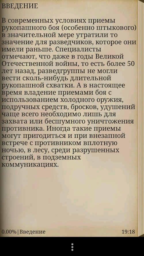В современных условиях приемы рукопашного боя (особенно штыкового) в значительной мере утратили то значение для разведчиков, которое они имели раньше. Специалисты отмечают, что даже в годы Великой Отечественной войны, то есть более 50 лет назад, разведгруппы не могли вести сколь-нибудь длительной рукопашной схватки. А в настоящее время владение приемами боя с использованием холодного оружия, подручных средств, бросков, удушений чаще всего необходимо лишь для захвата или бесшумного уничтожения противника. Иногда такие приемы могут пригодиться и при внезапной встрече с противником вплотную ночью, в лесу, среди разрушенных строений, в подземных коммуникациях. In modern conditions, unarmed combat techniques (especially bayonet) largely lost meaning for the scouts that they had before. Experts note that even during the Great Patriotic War, that is, over 50 years ago, could not conduct reconnaissance how a prolonged melee. And now the possession of the methods of battle using knives, improvised, throws, chokes often only necessary to capture or destroy the enemy silent. Sometimes these techniques can be useful when a sudden meeting with the enemy close at night in the woods, among the ruined buildings, in underground communications.