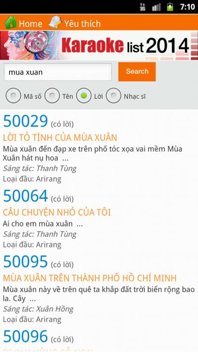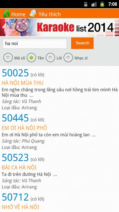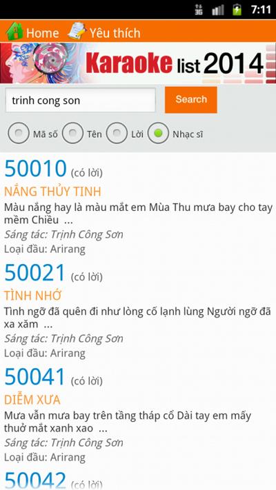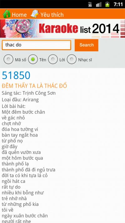 Ứng dụng tra cứu bài hát karaoke với 23.791 bài hát trên 2 loại đầu thu Arirang và California. Bạn có thể tra cứu theo Mã số, Tên bài hát, Lời bài hát và nhạc sĩ sáng tác.
