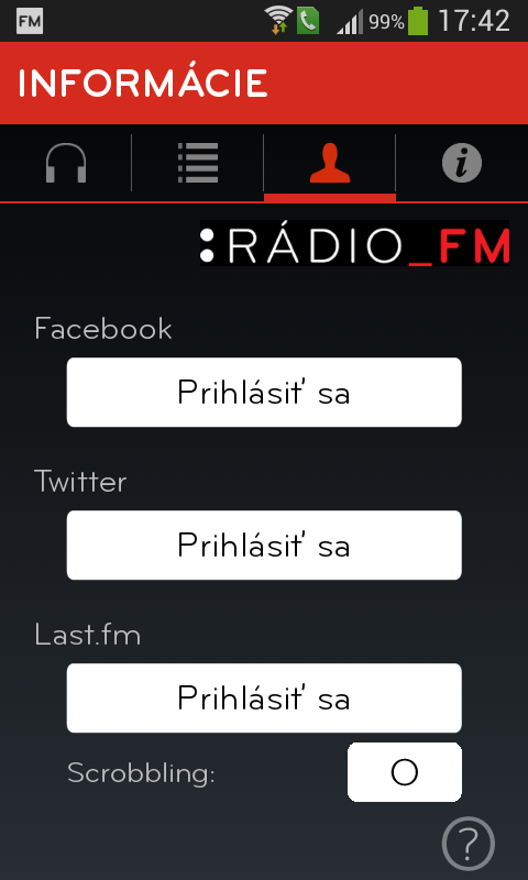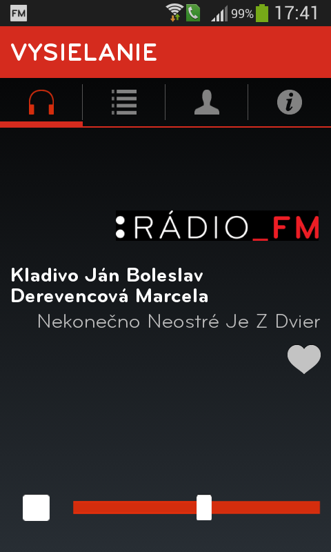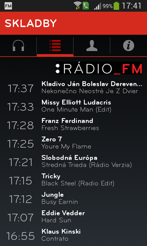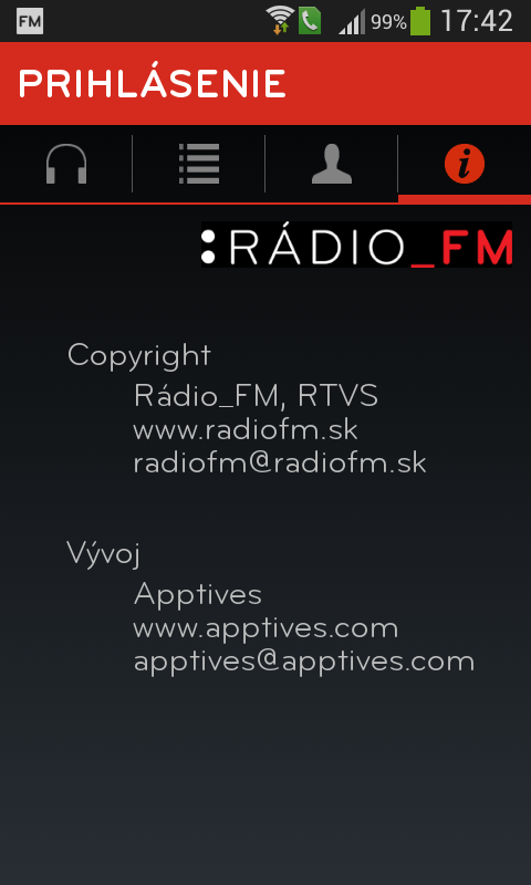 Radio_FM is a part of Radio and Television Slovakia. It's focused on young listeners who avoid consumer musical production and are interested in marginal alternative music genres such as indie, alternative rock, hip-hop & urban, worldmusic, drum and bass and so on. Through its broadcasting it tries to discover, highlight and promote music by artists who do not receive air time on the commercial broadcasters. This application will now bring it into your Android phone. Simply connect to WiFi or 3G network and listen to a live stream, watch the playlist and easily share your favorite song on facebook, twitter or on last.fm.
