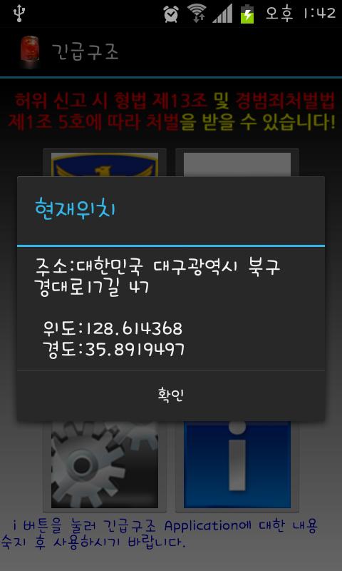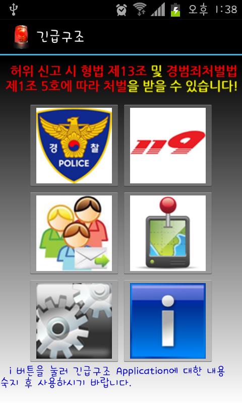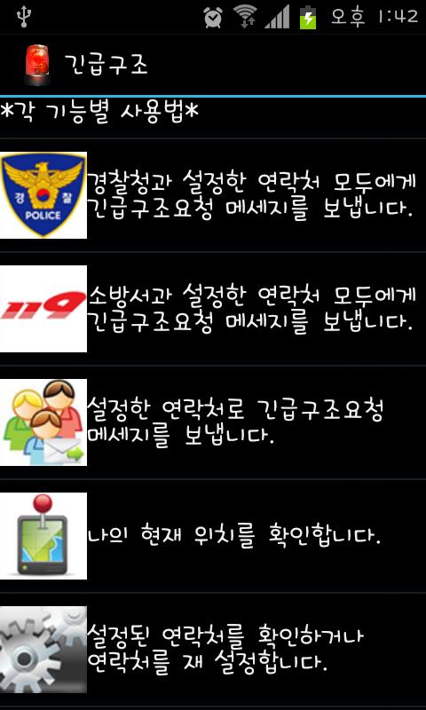 1. 납치 및 감금상태 등의 상황이 발생하여 전화로 구조요청을 할 수 없는 경우 미리 저장되어 있는 경찰청(112) 및 가족의 연락처로 피해자의 현재 위치에 대한 주소와 GPS좌표를 문자메세지로 전송하여 구조에 도움이 되도록하는 목적으로 제작되었습니다.