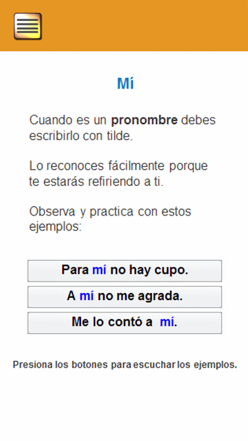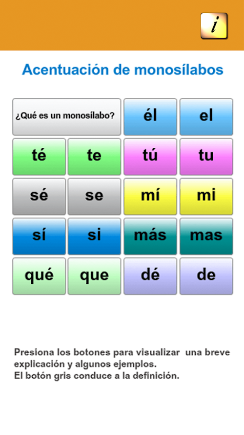 Esta app te permite avanzar en el proceso de consolidación de la acentuación, porque podrás distinguir fácil y rápidamente los monosílabos de acentuación diacrítica: mí, mi, él, el, tú, tu, sí, si, sé, se, dé, de, té, te, más y mas.