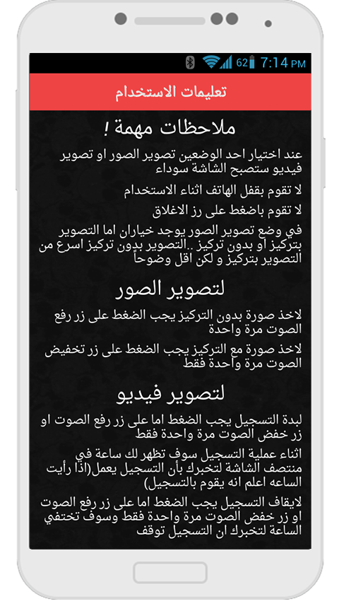 ** يمكنك التطبيق من التقاط الصور و تسجيل الفيديو و الشاشة مغلقة و من دون اصدار اي صوت عند بدء التصوير او التسجيل