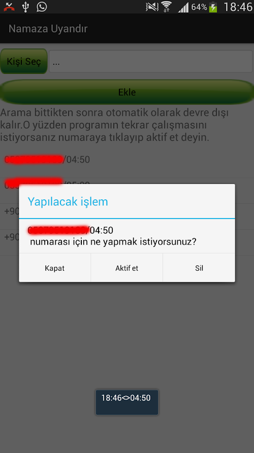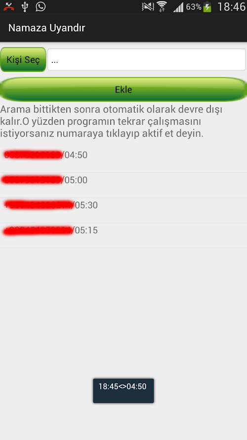 Arkadaşlarınızı namaza uyandırma programıdır.Listeden seçtiğiniz numaraları istediğiniz saatte aramaya yarar ve bunu hergün tekrarlayabilir.Arkadaşlarımı namaza kaldırmak için kullanıyordum sizlerde faydalanın diye markete ekledim.