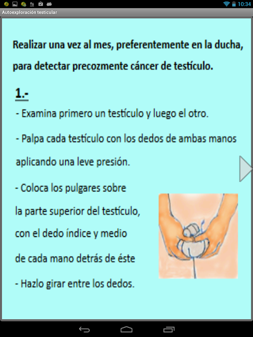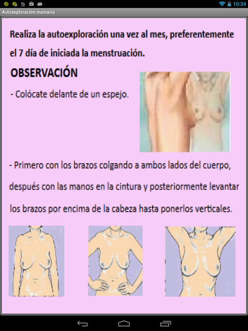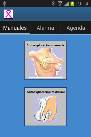 Aplicación que presenta de manera sencilla los manuales de autoexploración para detectar el cáncer de mama y de testículo. Dispone también de un sistema de notificación para recordar al usuario realizarse la prueba mensualmente y una agenda para llevar un registro de dichas pruebas. Application has simply manuals cancer self-examination to detect breast and testicle. It also has a notification system to remind the user testing and monthly calendar to keep track of such testing.