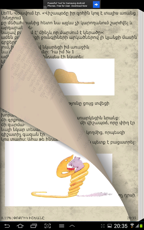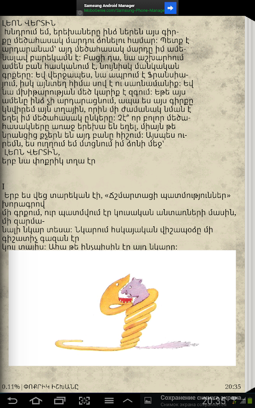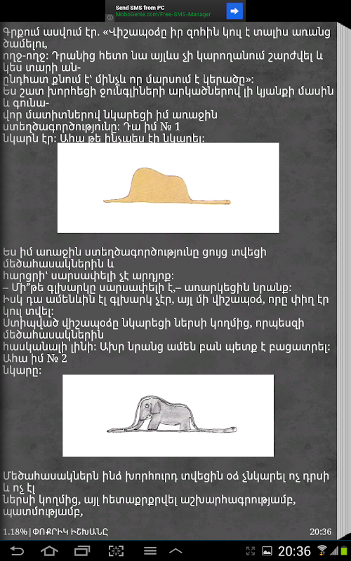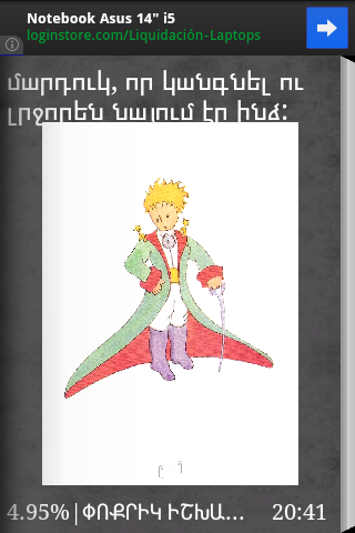 Գիրքը պատկերազարդ է:Ծրագիրը հեշտ և մատչլի օգտագործվում է , հիշեցնելով իրական գիրք : Ունի ցերեկային և գիշերային ռեժիմներ, որոնց շնորհիվ ավելի է հեշտանում կարդալը ՝ չառաջացնելով ավելորդ լարվածություն:Փոքրիկ իշխանը (ֆր.՝ Le Petit Prince), ֆրանսիացի արիստոկրատ, գրող, բանաստեղծ և օդաչու Անտուան դը Սենտ-Էքզյուպերիի վեպն է, հրատարակվել է 1943թ., համարվում է նրա ամենահայտնի ստեղծագործությունը։Առաջին անգամ հրատարակվել է Նյու-Յորքում` 1943թ. ապրիլի 6-ին «Reynal & Hitchcock» հրատարակչությունում: Սկզբից լույս է տեսել վեպի անգլերեն թարգմանությունը` «The Little Prince» անունով: Թարգմանվել է ավելի քան 250 լեզուների, այդ թվում` Բրայլի այբուբենով: Վաճառվել է ավելի քան 140 միլիոն օրինակ եւ համարվում է աշխարհում ամենավաճառված գրքերից մեկը: