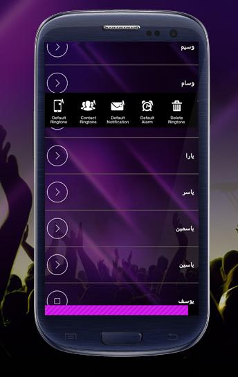 لإختيار رنة أو نغمة بإسمك ماعليك سوى الضغط على إسم الرنة ثم تحديد إن كنت تريدها كنغمة للهاتف، للرسائل أو للمنبه.