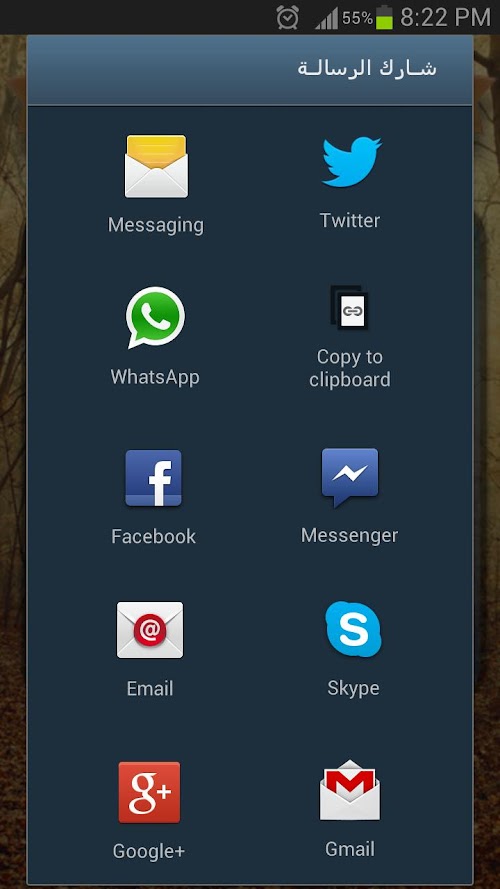 ★★★★★ تمتع بإمكانية مشاركة المسجات وإرسالها الى الأصدقاء: عبر فيس بوك ، واتس اب ، فايبر ، سكايب ، تويتر ، رسائل قصيرة وغيرها الكثير