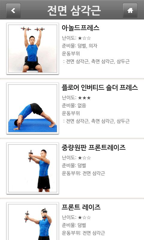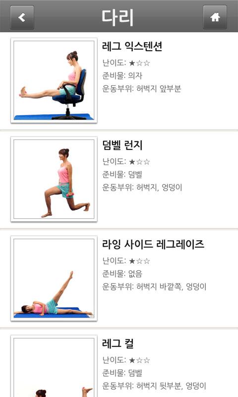 운동 사진 및 동영상과 함께, 부위별 운동, 운동별 난이도에 맞추어