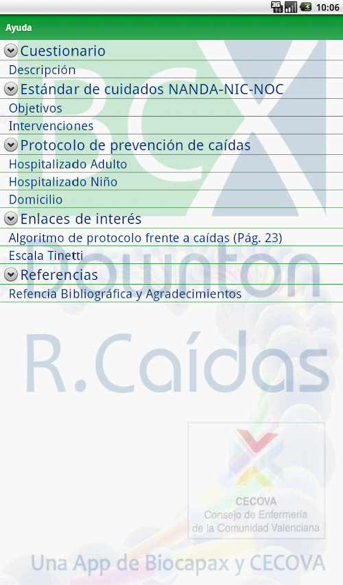 BCX DOWNTON RIESGO DE CAÍDAS es una aplicación pensada para su uso como apoyo a la actividad diaria de los profesionales sanitarios que deseen aumentar el grado de conocimiento del paciente y cuidadores sobre las medidas de prevención de caídas, aumentar las acciones personales o del cuidador para minimizar los factores de riesgo que podrían producir caídas en el entorno personal, así como, mantener la integridad corporal tanto en la hospitalización como en el domicilio de la persona.