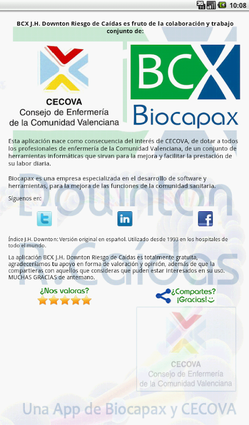 o visita http://www.biocapax.comFALL RISK DOWNTON BCX is an application designed for use as daily activity support healthcare professionals who wish to increase the level of knowledge of patients and caregivers on measures to prevent falls, increase personal actions or caregiver to minimize Risk factors that could cause falls in the personal environment, as well as, maintain bodily integrity in both the hospital and at home of the person.