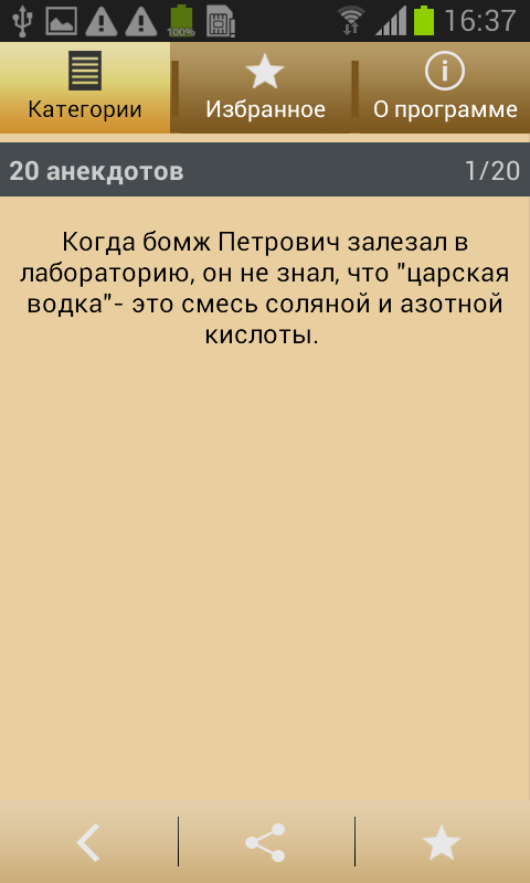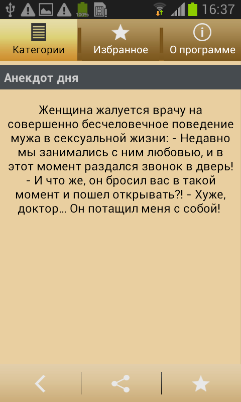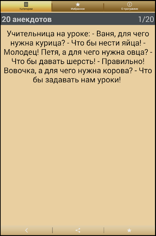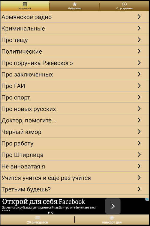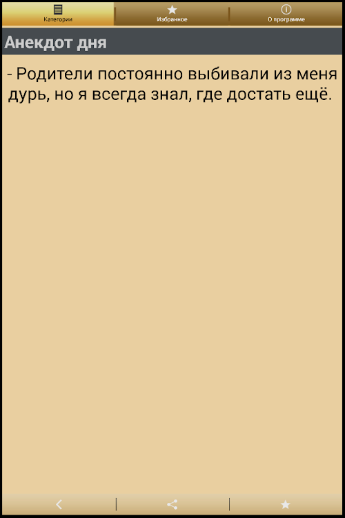 Приложение имеет широкий выбор возможностей распространение анекдотов – ВКонтакте, Facebook, Twitter и другие. Стоит Вашим друзьям прочесть сообщения на Вашей странице и они будут приятно удивлены.The most funny jokes, fresh and fun humor choice here. Did you know that laughter - one of the person's reaction to humor or tickling? In some cases, laughter can be a response to tension or be a symptom of the mental disorder. So we offer exclusively to laugh with humor.